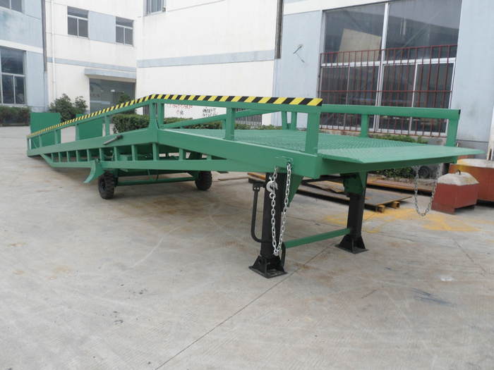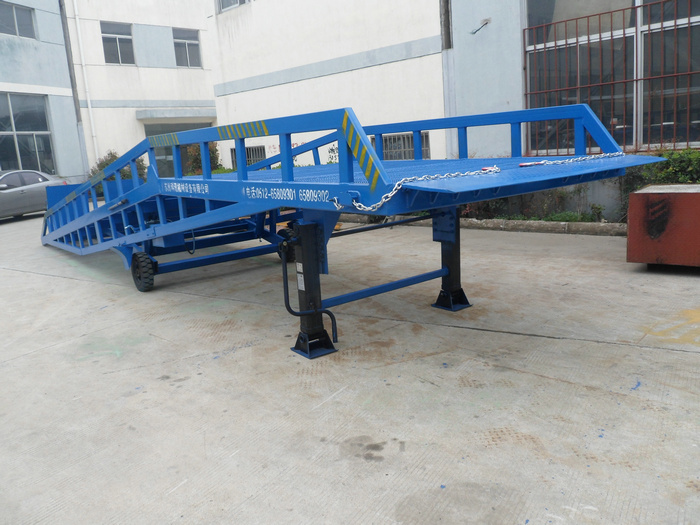 移動(dòng)式液壓登車橋是與叉車配合使用的貨物裝 卸專用輔助設(shè)備。有了它,叉車能直接從地面駛?cè)肫囓噹麅?nèi)部進(jìn)行 批量裝卸作業(yè)。產(chǎn)品采用人工液壓動(dòng)力,不需接動(dòng)力電源。只需單人操作,即可實(shí)現(xiàn)貨物的安全快速裝卸。