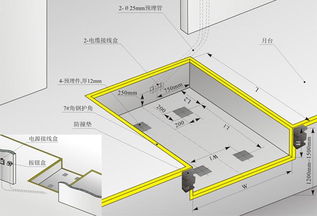 1、兩根預(yù)埋管分別走動(dòng)力電源線及控制電源線,管徑大于25毫米,走向視電源接線位置及按鈕安裝位置。